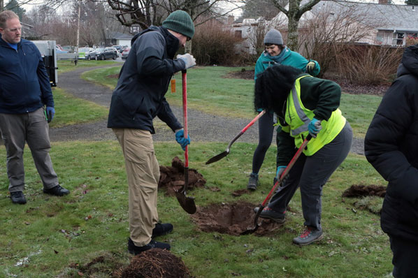 Leading the effort, for Portland Parks & Recreation (PP&R) Urban Forestry, was Urban Forestry Community Stewardship Workgroup Supervisor Nikhilesh Desai. “Today, we’re planting eleven trees – either southern Magnolia and Oregon white oaks,” he said.