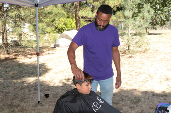 Volunteer hair stylist Jaqueem Coleman gives Caleb a trim at the event.