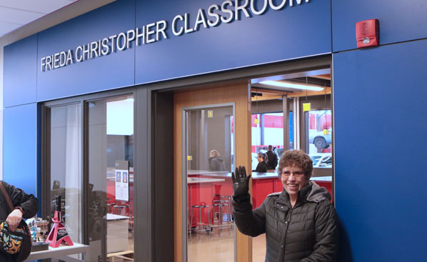 Touring the building, retired DDSD Board Member Frida Christopher stands at the entrance to the Auto Lab classroom that was named in her honor.