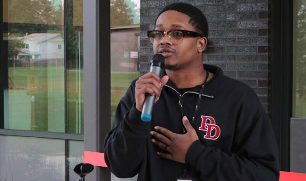 The M.C. of the Ribbon Cutting Ceremony, DDSD Family Engagement Specialist Tyrek “TD” McCullum, asks guests to gather for the ceremony.