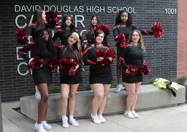 -8 Members of the DDHS Cheer Team provide an enthusiastic greeting for guests.