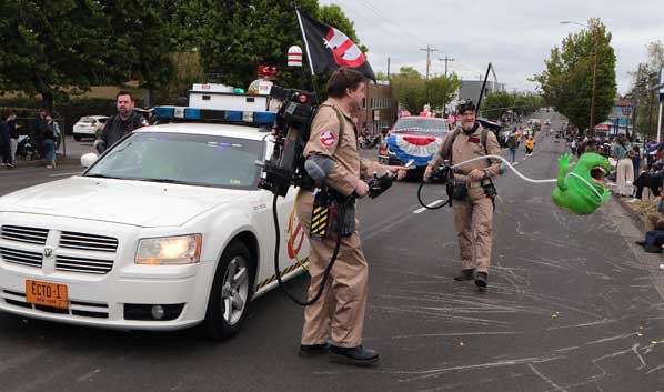 This nonprofit group, the Portland GhostBusters, puts on a lively show for spectators all along the route.