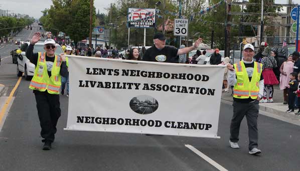 “Cleaning up” near the end of the parade are volunteers from the Lents Neighborhood Livability Association.