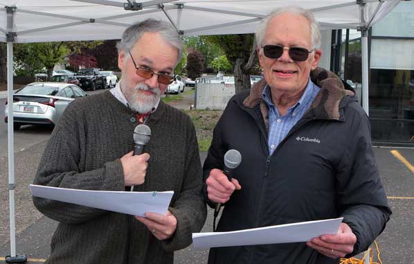 Narrating the parade for those near the PA system set up near the start of the parade route are perennial volunteer presenters Patrick Provant of Multnomah County Library and Eric G. Norberg, editor of Southeast Portland’s renowned THE BEE newspaper.