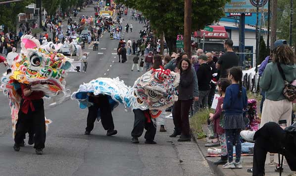 These Portland Lee’s Association Lion Dance Team members entertain the crowd along the route.