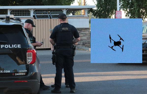 In a parking lot off NE Sandy Boulevard, an officer operates a drone. [Inset] Here’s that drone flying directly above NE Wygant Street at 101st Avenue.