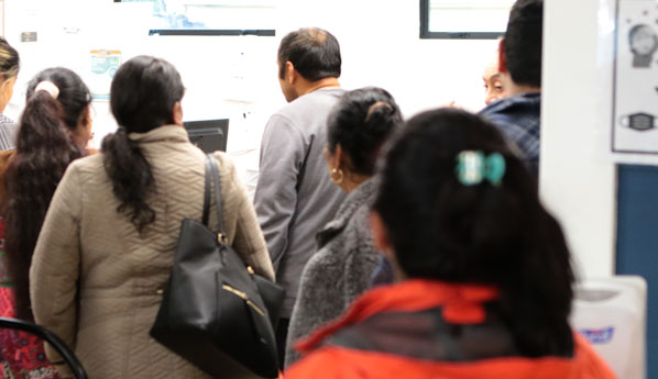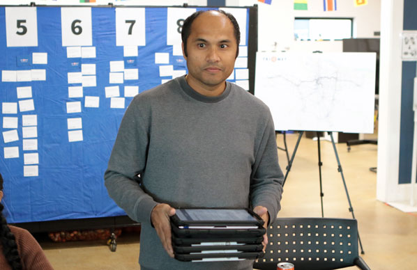 Som Subedi helps members of the Bhutanese take their surveys on electronic tablets.