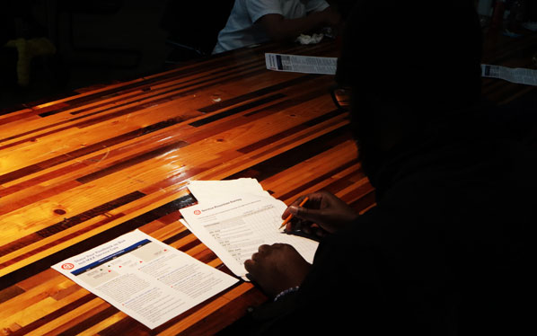 Many of the attendees complete surveys regarding proposed cuts to TriMet services.