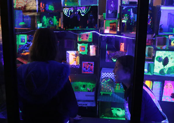 Visible from the sidewalk, through the windows of the Community Room, are these tiny living-room black-light illuminated, glowing dioramas.