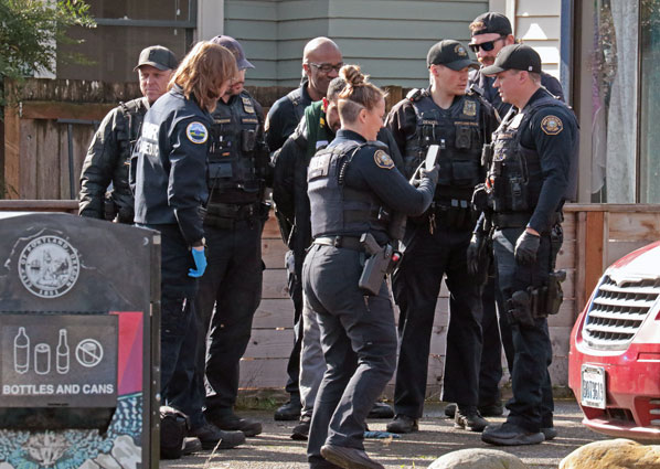A resident, standing across the street watching officers pull up, remarked that he believed the incident had started at S.E. 70th – but it ended up two blocks east, in the front yard of a triplex on the corner of Powell Boulevard at 72nd Avenue– where 12 officers had gathered.