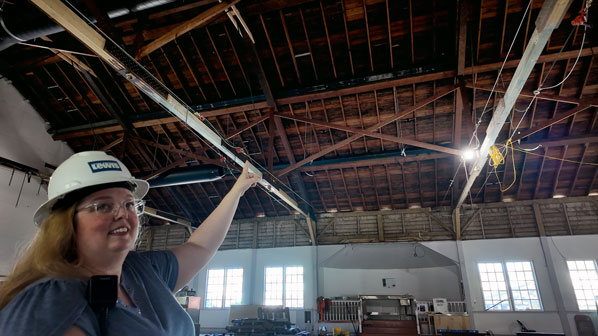 Pointing out the removed ‘drop ceiling’ is Oaks Park Association Marketing and Events Director Emily MacKay. She’s happy with how the renovation of theDance Pavilion is coming along.