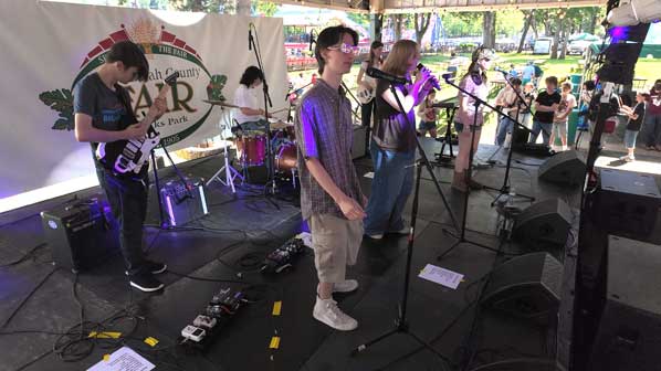 On stage in the Outdoor Pavilion, and “playing the hits”, are these advanced students of The School of Rock.