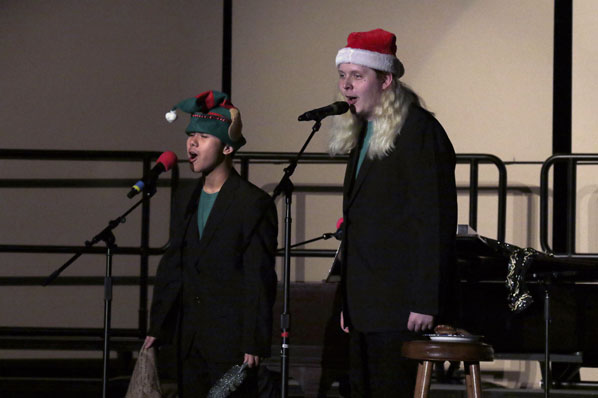 Costumed, and with cookies as props, Henry Nuygen and Hermes Taggard animatedly perform “Santa Claus is Coming to Town”.