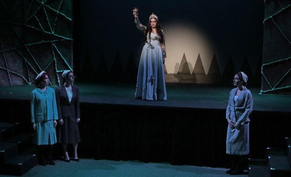 Here, as David Douglas High School Theater students rehearse their winter play Trap – in the spotlight, Norma Pike [played by student actor Lucy Stokes], the play’s central doomed figure, appears after the “incomprehensible event” takes place in front of astonished news reporters [played by student actors Justina Miller-Sanchez, Bella Pahomsky, and Ruby Wilson].