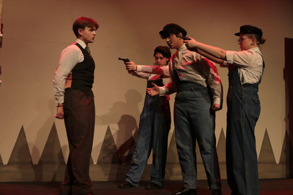 Wrongly convicted of murder, a handcuffed Jonathan Mollusk [played by student actor Griffin Bloomquist-Hulbert] is confronted by the father and two-armed henchmen [played by student actors (left to right) Vicky Juarez, Bruno Lopez, and Kaylan Caputo], after the disappearance of his son.