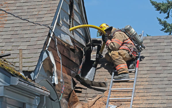 Using a water line, threaded through a hole cut in the rear of the roof and out the structure’s side, this firefighter sprays water on the fire in the attic and side wall of the house.