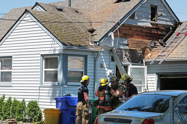 Some firefighters stand by as other crew members staunch the fire on the roof and inside the house. Notice how close the neighbor’s garage is the one that was burning.