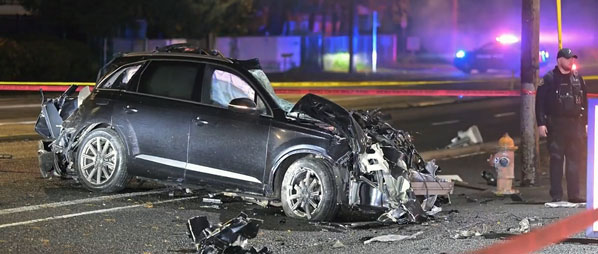 After speeding away from a police officer eastbound on SE Division Street east for 26 blocks, one of the cars smashes into a pole at SE 148th Avenue, leaving a debris field in the intersection.