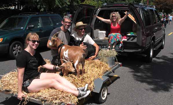 The Famous Belmont Goats – now the Famous Lents Goats – get a ride along the parade route.