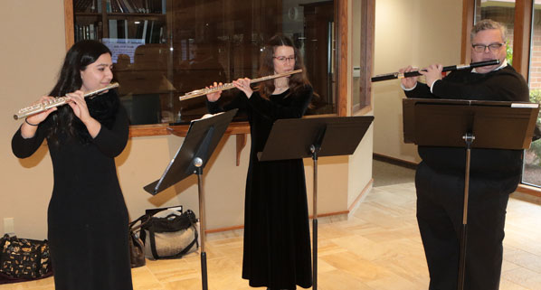 In the lobby of the Sunnyside Seventh-Day Adventist, the “Sunnyside Flutes” serenade early arrivals to this concert.