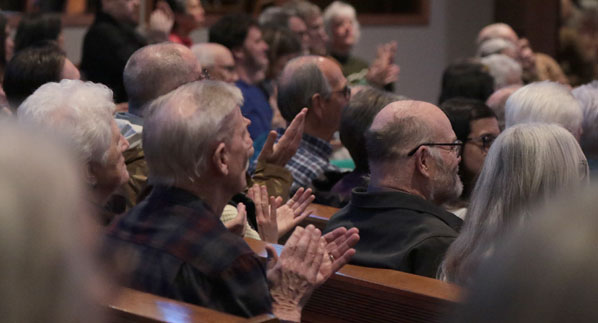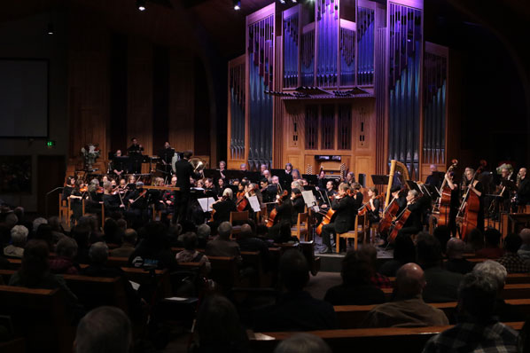 Long before the first note sounded, the sanctuary began to fill with regulars and first-time attendees. As has become a hallmark of the ensemble, conductor Jonathan DeBruyn began the afternoon with a “Pre-concert Talk” at 3 p.m. – talking the audience through the music to be performed, its composers, and some behind-the-scenes tales about his community orchestra.