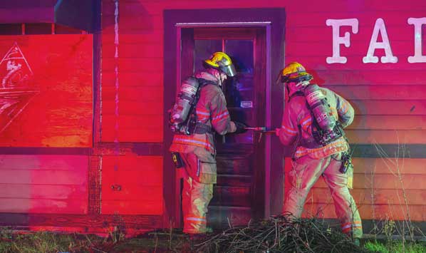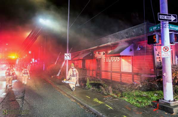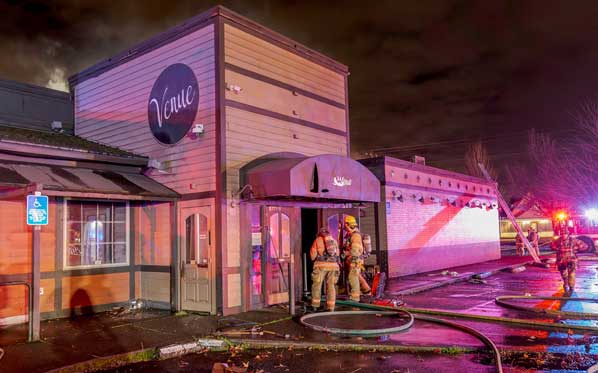Using crowbars, firefighters rip open the outside door to “Falco’s Pub”, which was connected to the blazing The Venue Gentlemen’s Club building. PF&R photo by Greg Muhr