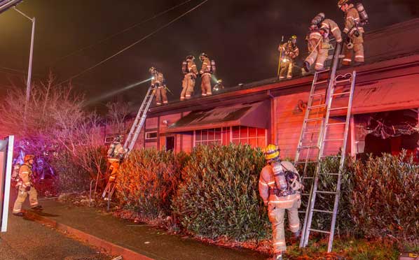 With the fire knocked down, crews head back to their rigs, parked along SE Stark Street. PF&R photo by Dennis Weis