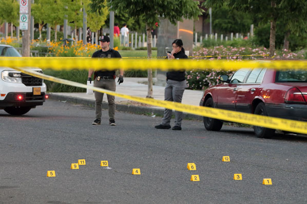 It didn’t take long for PPB officers to set up two crime scenes – one at Gateway Discovery Park, where they located more than a dozen spent shell casings – and the other where the getaway car was stuck half-way out of a neighbor’s fence.