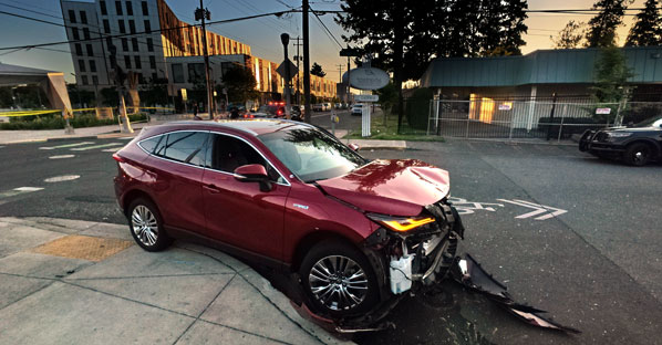 Across the intersection from the shooting at NE 106th Avenue and Halsey Street, a burgundy Toyota Venza XLE hybrid SUV – with a smashed front end – was stopped with its back tire on the sidewalk. Also noticeable were three fresh bullet holes in the passenger’s side of the vehicle, and another hole in the headrest.