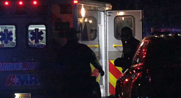 An ambulance prepares to rush a gunshot-wounded man to a hospital.