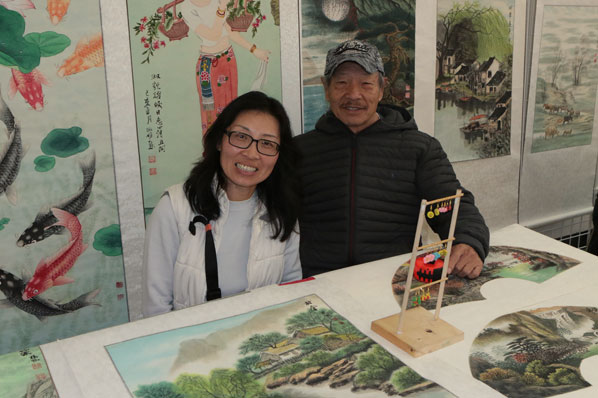 Nearby neighbor Nancy Yang helps her dad, Huai Yang, sell his original art. “No two are the same,” she says.