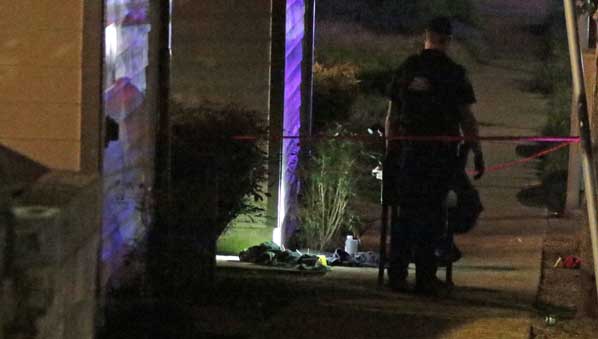 A passing rainstorm doesn’t hinder officers, as they investigate a shooting in this Lents neighborhood development.
