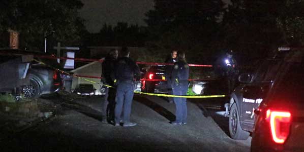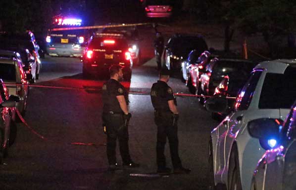 Police vehicles fill the narrow street as officers begin an investigation into this shooting.
