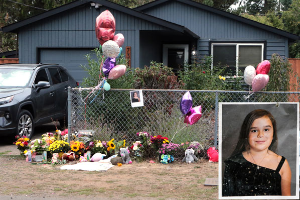 At the house, a sizable memorial to the slain girl and mother lines the fence.