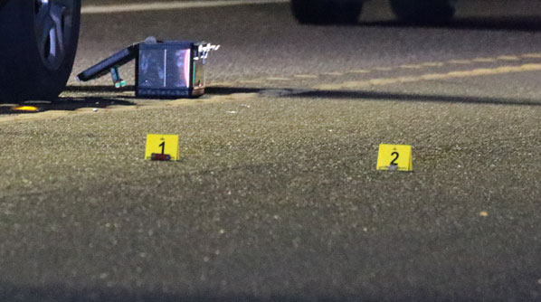 Officers find spent bullet shell casings in the street at the scene of this shooting.