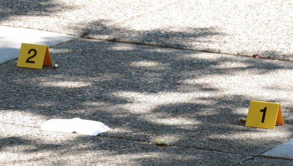 Two of three spent bullet shell casings are marked with yellow evidence markers.