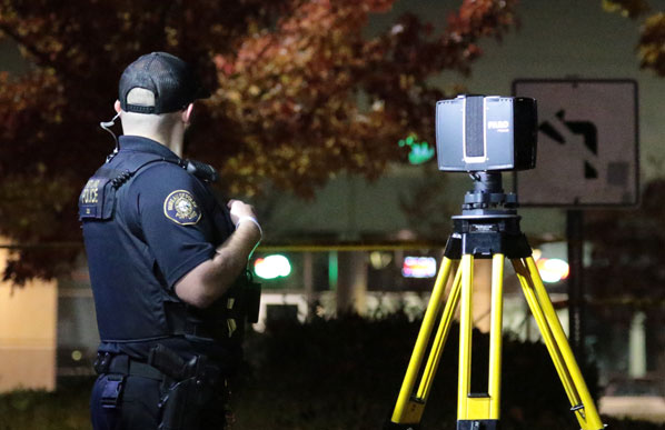 Ready to create a digital map, an officer sets up their FARO Crash Reconstruction unit.