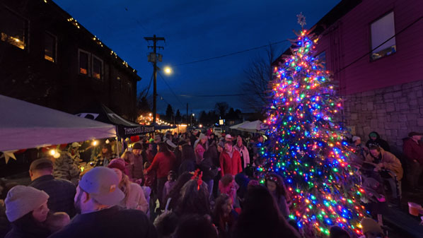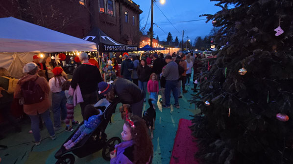 In Montavilla’s Public Street Plaza, folks gather for a fun evening that culminates with lighting their tree, starting their Montavilla Winterfest Holiday Celebration.