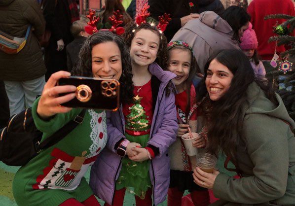 In the glow of the illuminated tree, people begin celebration of the Holidays in Montavilla.