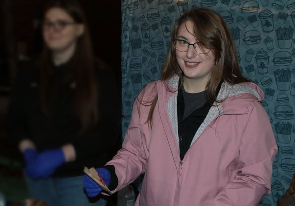 Montavilla neighborhood Burgerville representative Brianna Bauer gives out fresh chocolate chip cookies at the festive gathering.