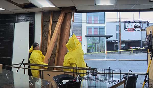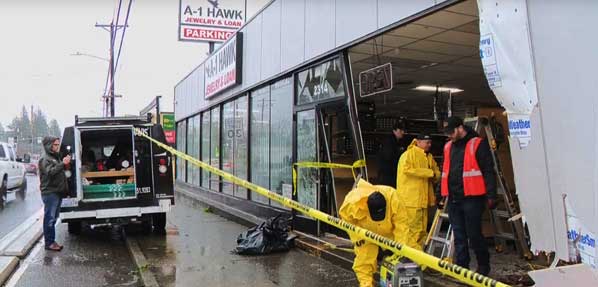 Disaster remediation workers begin the job of pulling debris from the front of this well-respected pawn shop, after a cars smashed into it. Courtesy KGW-TV News 8