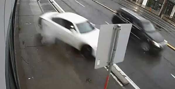 Surveillance images show this white car, driving backward – actually going west in the eastbound lanes of SE Division Street – before it jumped the concrete bike lane barriers and the curb, and smashed into the store.