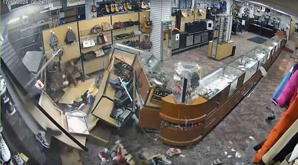 Inside, this surveillance image shows glass and debris being blown into the shop as the rear end of the car smashes into the front of the building.