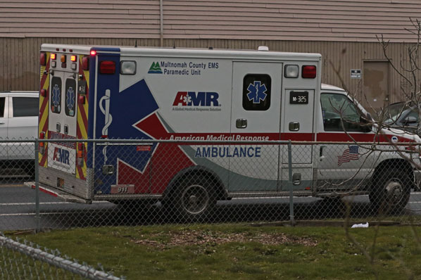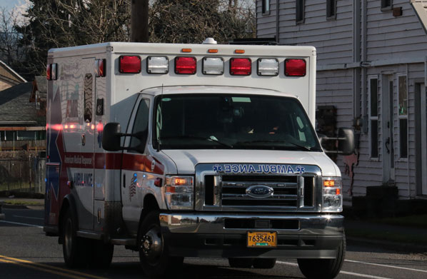 With a patient onboard, this ambulance is idling along SE Woodstock Boulevard, just before departing for a hospital.