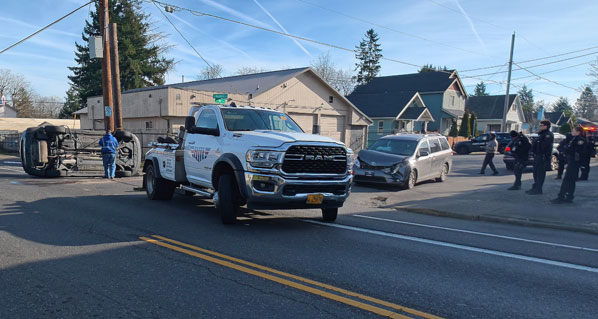 “As noted, this was a crash between a Toyota Sienna occupied by a family and a Nissan Rogue occupied by a [solo] driver,” Public Information Officer Sergeant Kevin Allen later told East Portland News. “The impact caused the Nissan to be flipped onto its side.