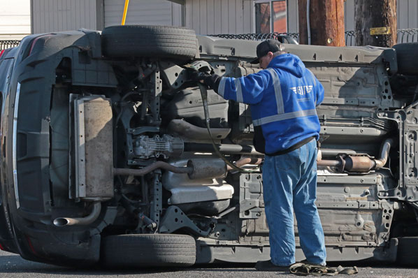 A tow driver hooks straps to the Nissan Rogue, preparing to tip it back onto its wheels.