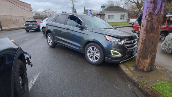Officers found a dark green Ford Edge SEL crossover SUV with driver’s side damage that had been stopped by a wooden utility pole.