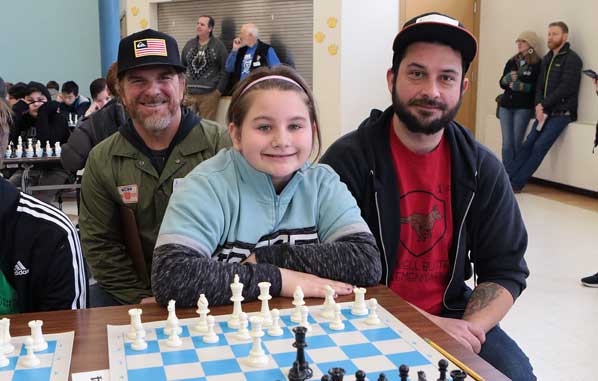 Powell Butte Elementary School volunteer chess coach John Naimo and Sean Power flank their sixth-grade student in the tournament, Emma Anundi-Boland.